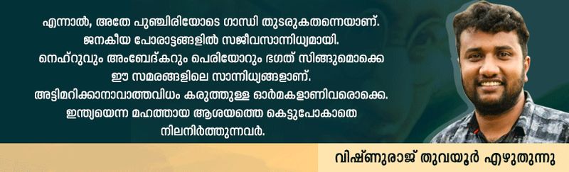 എന്നാല്, അതേ പുഞ്ചിരിയോടെ ഗാന്ധി തുടരുകതന്നെയാണ്. ജനകീയ പോരാട്ടങ്ങളില് സജീവസാന്നിധ്യമായി. നെഹ്റുവും അംബേദ്കറും പെരിയോറും ഭഗത് സിങ്ങുമൊക്കെ ഈ സമരങ്ങളിലെ സാന്നിധ്യങ്ങളാണ്. അട്ടിമറിക്കാനാവാത്തവിധം കരുത്തുള്ള ഓര്മകളാണിവരൊക്കെ. ഇന്ത്യയെന്ന മഹത്തായ ആശയത്തെ കെട്ടുപോകാതെ നിലനിര്ത്തുന്നവര്.