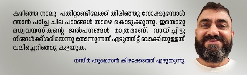 കഴിഞ്ഞ നാലു പതിറ്റാണ്ടിലേക്ക് തിരിഞ്ഞു നോക്കുമ്പോള് ഞാന് പഠിച്ച ചില പാഠങ്ങള് താഴെ കൊടുക്കുന്നു. ഇതൊരു മധ്യവയസ്കന്റെ ജല്പനങ്ങള് മാത്രമാണ്. വായിച്ചിട്ടു നിങ്ങള്ക്ക് ശരിയെന്നു തോന്നുന്നത് എടുത്തിട്ട് ബാക്കിയുള്ളത് വലിച്ചെറിഞ്ഞു കളയുക.