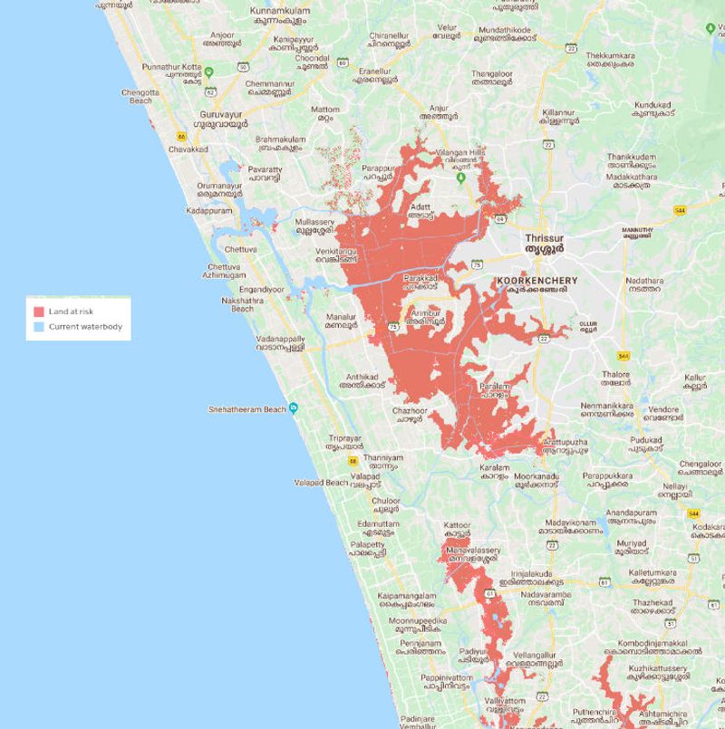 കോസ്റ്റല്ഡെം മോഡല് പ്രകാരം, കേരളത്തിന്റെ ഏതൊക്കെ ഭാഗങ്ങളാണ് സമുദ്രനിരപ്പ് കൂടുന്നത് മൂലം പ്രളയത്തില് അകപ്പെടാന് ഏറ്റവും സാധ്യതയെന്ന് നോക്കാം: