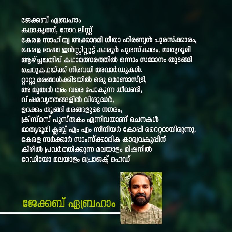 ഒറ്റ നോട്ടത്തില് ലളിതമാണ് ജേക്കബ് ഏബ്രഹാമിന്റെ കഥകള്. എന്നാല്, സൂക്ഷിച്ചുവായിക്കുമ്പോള്, ഏറ്റവും റീഡബിളായ ആ ലാളിത്യത്തിനുള്ളില് പാകിയ കുഴിബോംബുകള് കണ്ടെത്താം. പുറേമയ്ക്ക് ശാന്തമായി ഒഴുകുന്ന മനുഷ്യ ജീവിതങ്ങളിലെ ഇളകിമറിയുന്ന സങ്കീര്ണ്ണതകളാണ് ആ ലാളിത്യത്തിനുള്ളില് ഒളിച്ചിരിക്കുന്നത്. അതിവൈകാരികതയോ അതിഭാവുകത്വമോ കലര്ത്താതെ അത്യന്തം നിസ്സംഗനായ ഒരു കാഴ്ചക്കാരനെപ്പോലെയാണ് കഥാകൃത്ത് ആഖ്യാനത്തില് ഇടപെടുന്നത്. ആ നിര്വികാരത പക്ഷേ, ഒളിച്ചോട്ടമല്ല. നിലപാട് തന്നെയാണ്. വായനക്കൊടുവില് തിരിച്ചറങ്ങാന് പറ്റാത്ത വിധം വികാരങ്ങളുടെ വിക്ഷുബ്ധതയില് വായനക്കാരനെ തനിച്ചാക്കുന്നത് എഴുത്തിലെ ആ മനുഷ്യപ്പറ്റ് തന്നെയാണ്. അതിലെ കറുത്ത നര്മ്മവും അമ്പരപ്പിക്കുന്ന നിരീക്ഷണങ്ങളും അപ്രതീക്ഷിത വഴിത്തിരിവുകളും ചേര്ന്നാണ് കഥയുടെ ആ രാവണന് കോട്ട സാദ്ധ്യമാക്കുന്നത്.