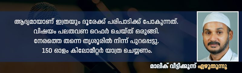 കോഴിക്കോടിന്റെ വടക്കുള്ള ഒരു ഗ്രാമത്തിലായിരുന്നു പരിപാടി. നോമ്പ് തുടങ്ങുന്നതിന്റെ മുമ്പുള്ള റമദാന് പ്രഭാഷണം. ഞായറാഴ്ച മഗ്രിബിനു ശേഷമാണ് പ്രോഗ്രാം. അഞ്ചു മണിക്കെങ്കിലും കോഴിക്കോടെത്തണമെന്ന് സംഘാടകര് അറിയിച്ചിരുന്നു.