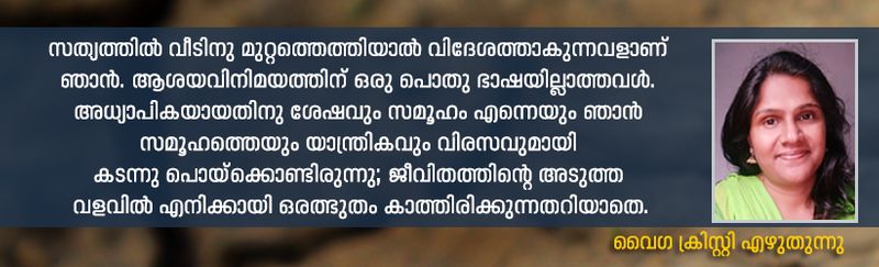 സത്യത്തില് വീടിനു മുറ്റത്തെത്തിയാല് വിദേശത്താകുന്നവളാണ് ഞാന്. ആശയവിനിമയത്തിന് ഒരു പൊതു ഭാഷയില്ലാത്തവള്. അധ്യാപികയായതിനു ശേഷവും സമൂഹം എന്നെയും ഞാന് സമൂഹത്തെയും യാന്ത്രികവും വിരസവുമായി കടന്നു പൊയ്ക്കൊണ്ടിരുന്നു; ജീവിതത്തിന്റെ അടുത്ത വളവില് എനിക്കായി ഒരത്ഭുതം കാത്തിരിക്കുന്നതറിയാതെ.