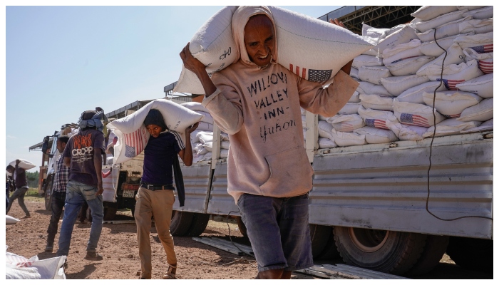 (യുഎസ് എയ്ഡ്സില് നിന്നുള്ള ഭക്ഷ്യധാന്യങ്ങൾ എത്യോപ്യയിലെ സാൻസാലിമ ഐഡിപി ക്യാമ്പിലേക്ക് കൊണ്ടു പോകുന്നു. ചിത്രം ഗെറ്റി)