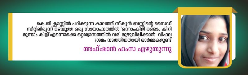 കെ.ജി ക്ലാസ്സിൽ പഠിക്കുന്ന കാലത്ത് സ്കൂൾ ബസ്സിന്റെ സൈഡ് സീറ്റിലിരുന്ന് മഴയുള്ള ഒരു സായാഹ്നത്തിൽ 'ഒന്നാംകിളി രണ്ടാം കിളി മൂന്നാം കിളി'എന്നൊക്കെ ഒറ്റശ്വാസത്തിൽ വരി മുഴുവിപ്പിക്കാൻ വിഫല ശ്രമം നടത്തിയതായി ഓർമ്മകളുണ്ട്. വിദ്യാസാഗറിന്റെ ഈണം എന്നെ ആ പഴയ ഓത്തു പള്ളിയിലേക്കും പ്രിയ കൂട്ടുകാരിലേക്കും നിഷ്കളങ്കമായ ബാല്യത്തിലേക്കും തിരിച്ചെത്തിക്കുന്നു. ഈ ഈണങ്ങൾ കേൾക്കുമ്പോൾ മനസ്സ് പച്ചപ്പുനിറഞ്ഞ ഇളം മഴപെയ്യുന്ന, മയിലുകളാടുന്ന വിശാലമായ പാടമായ് മാറുന്നു. ഇത്തരം അനുഭൂതികളെയെല്ലാം പവിഴമുത്തുകൾ കണക്കെ എന്റെ ഓർമ്മചിപ്പിയിൽ കാത്തുവെക്കാൻ ഈ ഗാനത്തിന് കഴിയുന്നു.