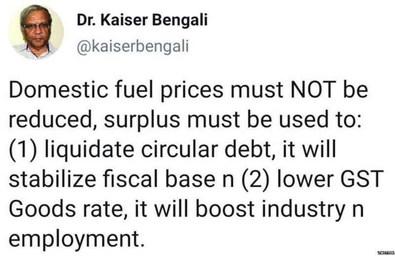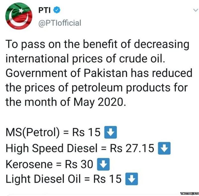 പാകിസ്ഥാൻ ഭരിക്കുന്ന പ്രധാനമന്ത്രി ഇമ്രാൻ ഖാന്റെ പാർട്ടിയാണ് PTI എന്നറിയപ്പെടുന്ന പാകിസ്ഥാൻ തെഹ്രീകെ ഇൻസാഫ്. പാർട്ടിയുടെ ഔദ്യോഗിക ട്വിറ്റർ ഹാൻഡിലിൽ നിന്ന് കഴിഞ്ഞ ദിവസം ഒരു ട്വീറ്റ് വരികയുണ്ടായി. അത് ഇങ്ങനെയായിരുന്നു. "അന്താരാഷ്ട്ര വിപണിയിലെ ക്രൂഡോയിൽ വിലക്കുറവിന്റെ ഗുണഫലങ്ങൾ പൊതുജനങ്ങളിലേക്ക് എത്തിക്കുക എന്ന ഉദ്ദേശ്യവുമായി പാകിസ്ഥാൻ ഗവണ്മെന്റ് മെയ് മാസത്തിലെ ഇന്ധന വിലകളിൽ താഴെപ്പറയുന്ന ഇളവുകൾ വരുത്താൻ തീരുമാനിച്ചിരിക്കുകയാണ്. പെട്രോൾ - 15 രൂപ, ഹൈ സ്പീഡ് ഡീസൽ - 27.15 രൂപ, മണ്ണെണ്ണ - 30 രൂപ, ലൈറ്റ് ഡീസൽ ഓയിൽ - 15 രൂപ.