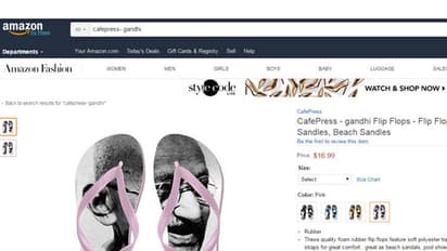 മഹാത്മാഗാന്ധിയുടെ ചിത്രം പ്രിന്റ് ചെയ്ത ചെരുപ്പ് വില്പ്പനയ്ക്ക് വച്ച് ഓണ്ലൈന് വില്പ്പന ശൃഖലയായ ആമസോണ് വീണ്ടും വിവാദത്തില്. നേരത്തെ ദേശീയ പതാകയുടെ നിറത്തിലുള്ള ചവിട്ടി വില്പ്പനയ്ക്ക് വച്ച് ആമസോണ് വിവാദത്തിലായിരുന്നു. കേന്ദ്ര വിദേശകാര്യ മന്ത്രി സുഷമ സ്വരാജിന്റെ താക്കീതിനെതുടര്ന്നാണ് ഉത്പ്പന്നം പിന്വലിച്ച് ആമസോണ് മാപ്പുപറഞ്ഞിരുന്നു.