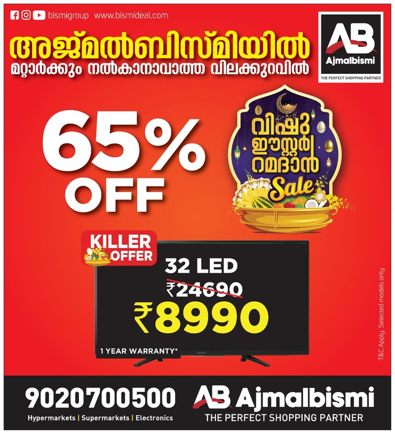 65% വരെ വില ക്കുറവിൽ സ്മാർട്ട് ടിവികൾ ലഭ്യമാണ്. സ്മാർട്ട് ടിവികൾക്ക് പുറമെ റെഫ്രിജറേറ്ററുകൾ, വാഷിങ്ങ് മെഷീ നുകൾ, സ്മാർട്ട്ഫോണുകൾ, ലാപ്ടോപ്പുകൾ, ആക്സസറികൾ തുടങ്ങിയവക്കെല്ലാം മികച്ച വിലക്കുറവാണ് ഒരുക്കിയിട്ടുളളത്. കൂടാതെ, പഴയതോ ഉപയോഗശൂന്യമായതോ ആയ ഉത്പ്പന്നങ്ങൾ, ഗൃഹോപകരണങ്ങൾ തുടങ്ങിയവ ഏറ്റവും കൂടിയ വിലയിൽ എക്സ്ചേഞ്ച് ചെയ്ത് പുതിയവ വൻ വിൽക്കുറവിൽ സ്വന്തമാക്കാനും വിഷു ഈസ്റ്റർ റമദാൻ സെയിലിന്റെ ഭാഗമായി അവസരമുണ്ട്.