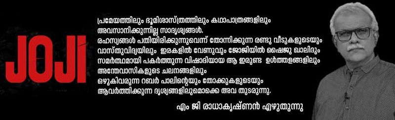 കോവിഡ് കാലത്തിന്റെയും ഓൺലൈൻ വ്യാപാരത്തിന്റെയുമൊക്കെ സൂചനകൾ ഒഴിച്ചാൽ 1980കളിലെ ഇരകൾ പ്രത്യക്ഷവും പരോക്ഷവുമായി ആവിഷ്ക്കരിച്ച രാഷ്ട്രീയ-സാമൂഹിക-മനഃശാസ്ത്ര പ്രപഞ്ചത്തെയും ഭാവുകത്വത്തെയും പോലെ നമ്മുടെ കാലത്തെക്കുറിച്ച് പുതുതായി എന്തെങ്കിലും പറയുന്നുണ്ടോ ജോജി?