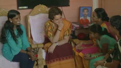 പുൽവാമ രക്തസാക്ഷി വസന്തകുമാറിന്റെ വീട്ടിൽ വച്ച് പ്രിയങ്ക ഗാന്ധി ശ്രീധന്യയെ അഭിനന്ദിക്കുന്നു