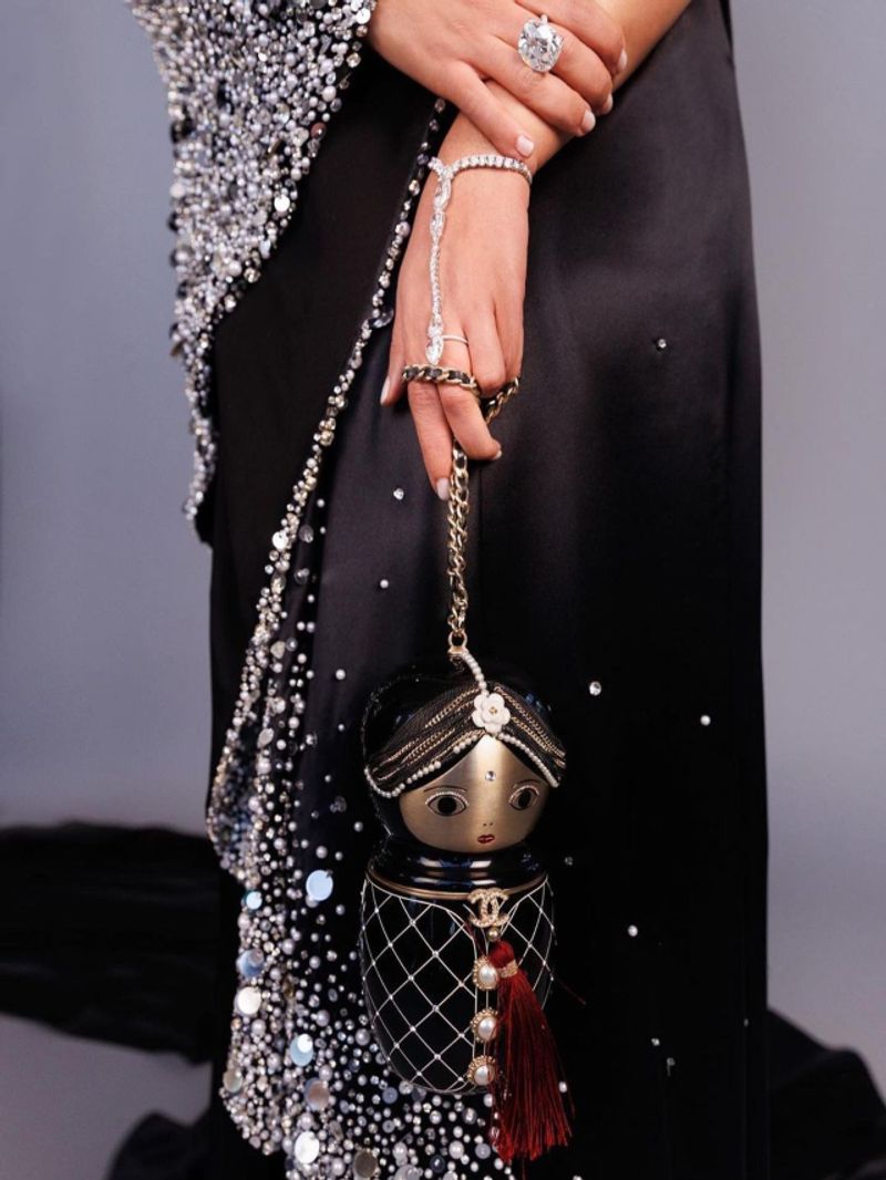 കറുത്ത നിറത്തിലുള്ള സാറ്റിൻ സാരി ഗൗണിലാണ് ഇഷ അംബാനി മിന്നിത്തിളങ്ങിയത്. ഇഷയുടെ ഗൗൺ മുത്തുകളും വജ്രങ്ങളും കൊണ്ട് മനോഹരമായി ഡിസൈൻ ചെയ്തിരുന്നു. നേപ്പാളി-അമേരിക്കൻ ഡിസൈനർ പ്രബൽ ഗുരുങ്ങിന്റെ ശേഖരത്തിൽ നിന്നുള്ള വസ്ത്രമാണ് ഇഷ അംബാനി ധരിച്ചത്. തിളങ്ങുന്ന ഗൗണിന് ചേരുന്ന ഡയമണ്ട് നെക്ലേസും ഇഷ ധരിച്ചിരുന്നു. എന്നാൽ വസ്ത്രത്തേക്കാൾ ശ്രദ്ധ പിടിച്ചുപറ്റിയത് ഇഷ അംബാനിയുടെ കൈയ്യിൽ ഉണ്ടായിരുന്ന ഡോൾ ബാഗ് ആണ്.