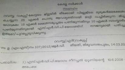 ക്ഷേത്ര നിര്മാണത്തിനുള്ള ഭൂമി എസ്എന്ഡിപി യോഗം മീനച്ചില് യൂണിയന്റെ പേരിലും സാംസ്കാരിക കേന്ദ്രം നിര്മിക്കുന്നതിനുള്ള ഭൂമി എസ്എന് ട്രസ്റ്റിനുമാണു പതിച്ചു നല്കിയത്. 2008ല് എസ്എന്ഡിപി യോഗം നല്കിയ അപേക്ഷ പരിഗണിച്ചായിരുന്നു സര്ക്കാര് നടപടി.
