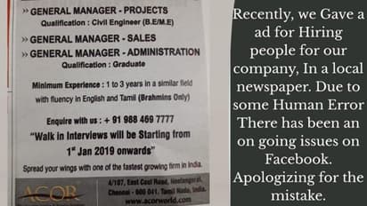 ചെന്നൈ: ജോലി ഒഴിവുകളിൽ ബ്രാഹ്മണർക്ക് മാത്രം അവസരമെന്ന് കാണിച്ച് നൽകിയ പരസ്യത്തിനെതിരെ വിമര്ശനം രൂക്ഷമായതോടെ ക്ഷമാപണവുമായി സ്വകാര്യ കമ്പനി. ചെന്നൈ കേന്ദ്രമാക്കി പ്രവർത്തിക്കുന്ന സ്വകാര്യ ഇന്റീരിയർ ഡിസൈൻ കമ്പനിയായ അക്കോർ ആണ് അഡയാർ ടോക്ക് എന്ന് പ്രാദേശിക പത്രത്തില് പരസ്യം നൽകിയത്.
