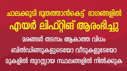 ചാലക്കുടി ഭൂതത്താൻ കെട്ട് ഭാഗങ്ങളിൽ എയർ ലിഫ്റ്റിങ് ആരംഭിച്ചു. മരങ്ങൾ തടസം ആകാത്ത വിധം ബിൽഡിങ്ങുകളുടെയോ വീടുകളുടേയോ മുകളിൽ തുറസ്സായ സ്ഥലങ്ങളിൽ നിൽക്കുക.