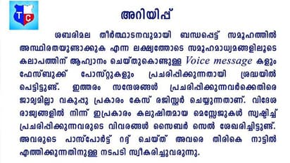 തിരുവനന്തപുരം: ശബരിമല തീർത്ഥാടന വിഷയവുമായി ബന്ധപ്പെട്ട് സമൂഹമാധ്യങ്ങൾ വഴി വിദ്വേഷപ്രചാരണം നടത്തുന്നവർക്ക് മുന്നറിയിപ്പുമായി സിറ്റി പൊലീസ് കമ്മീഷണർ. കലാപം സൃഷ്ടിക്കുക എന്ന ലക്ഷ്യത്തോടെ സമൂഹമാധ്യമങ്ങളിലൂടെ പോസ്റ്റുകളും മെസ്സേജുകളും പ്രചരിപ്പിക്കുന്നവർക്കെതിരെ ജാമ്യമില്ലാ വകുപ്പ് പ്രകാരം കേസെടുക്കുമെന്ന് പൊലീസ് മുന്നറിയിപ്പ് നൽകുന്നു. സിറ്റി പൊലീസ് കമ്മീഷണറുടെ ഒഫീഷ്യൽ ഫേസ്ബുക്ക് പേജിലാണ് ഇത് സംബന്ധിച്ച പോസ്റ്റ്. വിദേശരാജ്യങ്ങളിലിരുന്ന കലാപത്തിന് ആഹ്വാനം ചെയ്യുന്നവരുടെ പാസ്പോർട്ട് റദ്ദാക്കുമെന്നും അവരെ തിരികെ നാട്ടിലേക്ക് എത്തിക്കാനുള്ള നടപടികൾ കൈക്കൊള്ളുമെന്നും പൊലീസ് അറിയിക്കുന്നു.