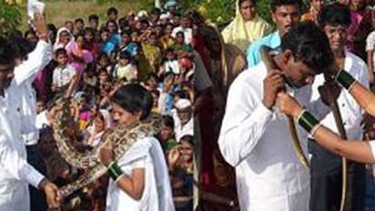 പൂമാലകള്ക്കുപകരം പാമ്പുകളാണ് ഇവര് വരണമാല്യമായി ചാര്ത്തിയത്. സിദ്ധാർഥ് സൊനാവാനെ, ഭാര്യ ശ്രുസ്തി ഔസർമാൽ എന്നിവരാണ് പാമ്പുകളെ പരസ്പരം കഴുത്തിലണിയിച്ച് വിവാഹിതരായ അപൂര്വ ദമ്പതികള്. 2010 നവംബര് 12ന് മഹാരാഷ്ട്രയിലെ കുഗ്രാമമായ ബീഡ് ജില്ലയിലാണ് ഈ അപൂര്വ വിവാഹം നടന്നത്. ഇരുവരും വൈൽഡ്ലൈഫ് ഡിപാർട്ട്മെന്റിലെ ഉദ്യോഗസ്ഥരാണ്.