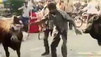 ചത്തീസ്ഖണ്ഡിലെ കോർബയിലാണ് സംഭവം. വഴി വക്കിൽ പരസ്പരം കൊമ്പ് കോർക്കുകയായിരുന്ന രണ്ടു കാളകൾക്ക് ഇടയില് കയറാന് ഒരുങ്ങുന്ന മദ്യപാനിയെ ഒരാള് തടയാന് ശ്രമിക്കുന്നതും അദ്ദേഹത്തെ തട്ടി മാറ്റിയ മദ്യപാനി ഇരുകാളകളുടെയും തലയിൽ പിടിച്ചു മാറ്റുന്നതുമാണ് വീഡിയോയുടെ ആദ്യഭാഗത്തുള്ളത്. എന്നാൽ, ഞൊടിയിടയിൽ മുമ്പോട്ട് കുതിച്ച ഒരു കാള ഇയാളെ കുത്തുകയും അന്തരീക്ഷത്തിലേക്ക് എടുത്ത് എറിയുകയുമായിരുന്നു. തെറിച്ച് നിലത്തേക്കു വീണ മദ്യപാനി അവിടെ നിന്നും എഴുന്നേറ്റ് സമീപത്തേക്കു മാറിയിരിക്കുന്നു. ഈ സമയം കാളകൾ വീണ്ടും പോര് തുടരുകയും ദൃശ്യങ്ങളിൽ കാണാം.