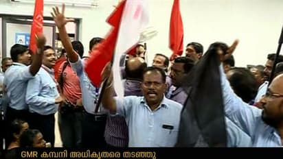 കേന്ദ്രസര്ക്കാര് തീരുമാനത്തിന് പിന്നാലെ വിമാനത്താവളത്തിലെത്തുന്ന ആദ്യത്തെ കമ്പിനിയാണ് ജിഎംആര്. ജിഎംആര് കമ്പിനി അധികൃതര് ആക്റ്റിംഗ് ഡയറക്ടറുടെ മുറിയില് പ്രവേശിച്ചതോടെ സമരസമിതി പ്രവര്ത്തകര് മുറിയിലെത്തി തടയുകയായിരുന്നു. പൊലീസെത്തി മദ്ധ്യസ്ഥ ചര്ച്ച നടത്തിയതോടെ ജീവനക്കാര് സമരം അവസാനിപ്പിച്ച് പിരിഞ്ഞുപോയി. വിമാനത്താവളത്തിന്റെ സ്വകാര്യവത്കരണത്തിനെതിരെ 51 ദിവസമായി ജീവനക്കാര് സമരം ചെയ്ത് വരികയായിരുന്നു.