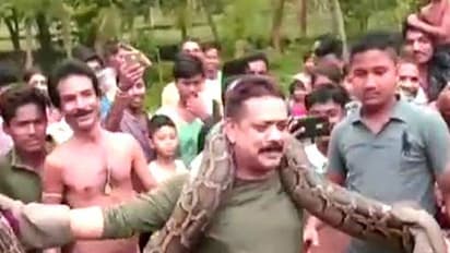 കൊല്ക്കത്ത: പെരുമ്പാമ്പിനേയും വച്ച് ആള്ക്കൂട്ടത്തിന് മുന്നില് ഷോ നടത്തിയ ഫോറസ്റ്റ് റേഞ്ചര്ക്ക് കിട്ടിയ പണി സോഷ്യല് മീഡിയയില് വൈറലാവുന്നു. ഭീമന് പെരുമ്പാമ്പിനെ പിടികൂടിയ ഫോറസ്റ്റ് ഓഫീസര് ഇരുതോളിലുമായി അതിനെയും എടുത്ത് മൊബൈല് ക്യാമറകള്ക്ക് മുന്പില് പോസ് ചെയ്യുന്നതിനെ പെരുമ്പാമ്പ് കഴുത്തിന് ചുറ്റുകയായിരുന്നു.