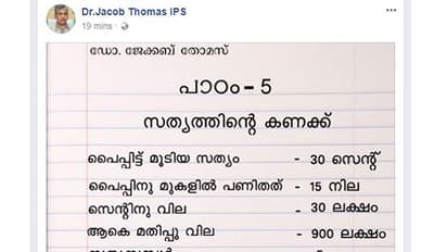 സത്യത്തിന്റെ മുഖം സ്വീവേജ് പൈപ്പുപോലെ എന്നാണ് ജേക്കബ് തോമസ് കുറിച്ചിരിക്കുന്നത്.