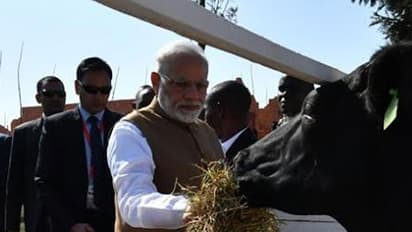 റുവാണ്ടയിലെ ഗ്രാമീണർക്ക് പശുക്കൾ സമ്മാനിച്ചത് മറ്റാരുമല്ല. പ്രധാനമന്ത്രി നരേന്ദ്ര മോദി. പാട്ടു പാടിയും കൈയ്യടിച്ചും മോദിയെ ഗ്രാമീണർ സ്വീകരിച്ചു. പശുക്കളെയെല്ലാം മോദി നടന്നു കണ്ടു. ഒപ്പം റുവാണ്ടൻ പ്രസിഡന്റ് പോൾ കഗാമെയും. പശുക്കളെ സ്നേഹിക്കുന്ന ആഫ്രിക്കൻ ഗ്രാമം അത്ഭുതപ്പെടുത്തിയെന്ന് പ്രധാനമന്ത്രി