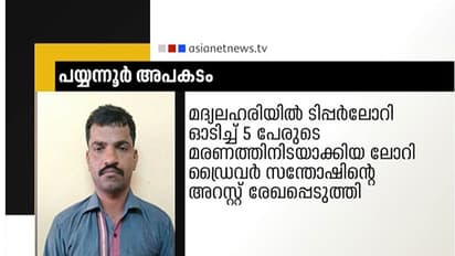 പയ്യന്നൂര് കുന്നരുവില് മദ്യലഹരിയില് ടിപ്പര്ലോറി ഓടിച്ച് അഞ്ചു പേരുടെ മരണത്തിനിടയാക്കിയ ലോറി ഡ്രൈവര് സന്തോഷിന്റെ അറസ്റ്റു രേഖപ്പെടുത്തി. ഇയാള്ക്കെതിരെ ഇന്ത്യന് ശിക്ഷാ നിയമം 304ഉം 308ഉം ചുമത്തി കുറ്റകരമായ നരഹത്യക്കും കേസെടുത്തിട്ടുണ്ട്. ഇയാളെ ഇന്ന് തന്നെ കോടതിയില് ഹാജരാക്കും. അതേസമയം ഗുരുതരമായി പരിക്കേറ്റവരില് ശ്രീജിത് എന്നയാളെ മംഗലാപുരത്തെ ആശുപത്രിയിലേക്ക് മാറ്റി. കഴിഞ്ഞ ദിവസം മരിച്ച മൂന്നുവയസ്സുകാരി ആരാധ്യയുടെ അച്ഛനാണ് ശ്രീജിത്ത്. ശ്രീജിതിന്റെ ഭാര്യ ആശയും പരുക്കേറ്റ് ചികിത്സയിലാണ്. അപകടത്തില് മരണപ്പെട്ടവരുടെ പോസ്റ്റ്മോര്ട്ടം നടപടികള് പുരോഗമിക്കുകയാണ്.