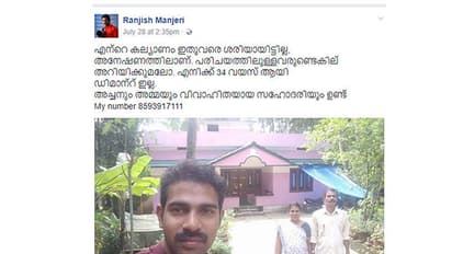'എന്റെ കല്യാണം ഇതുവരെ ശരിയായിട്ടില്ല, അന്വേഷണത്തിലാണ്. പരിചയത്തിലുള്ളവരുണ്ടെങ്കിൽ അറിയിക്കുമല്ലോ... എനിക്ക് 34 വയസ് ആയി ഡിമാന്റ് ഇല്ല. അച്ഛനും അമ്മയും വിവാഹിതയായ സഹോദരിയും ഉണ്ട്..' ഈ കുറിപ്പിനൊപ്പം സ്വന്തം മൊബൈൽ നമ്പറും രഞ്ജിഷ് ഫേസ്ബുക്കിൽ നൽകി.