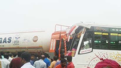 നിര്ത്തിയിട്ട ബസിനെ മറികടക്കാന് ശ്രമിച്ച ക്വാളിസിനെ വെട്ടിച്ച് കടക്കുന്നതിനിടെ നിയന്ത്രണം വിട്ട ടാങ്കര് ലോറി ബസിനെ ഇടിക്കുകയായിരുന്നു. ഡ്രൈവറുടെ ഭാഗത്തേക്കാണ് ടോങ്കര് ലോറി ഇടിച്ച് കയറിയത്. ബസിന്റെയും ലോറിയുടെയും മുന്ഭാഗം ഏതാണ്ട് പൂര്ണ്ണമായും തകര്ന്നു. ടാങ്കര് ലോറി ഡ്രൈവറെ ക്യാബിന് വെട്ടിപ്പൊളിച്ചാണ് രക്ഷപ്പെടുത്തിയത്.