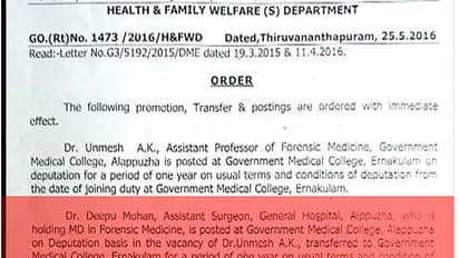 ഫോറന്സികില് ബിരുദാനന്തര ബിരുദമുള്ളതിനാല് ഡെപ്യൂട്ടേഷന് വ്യവസ്ഥയില് നിയമനമെന്നാണ് ഉത്തരവില് കാണിച്ചിട്ടുള്ളത്. ആലപ്പുഴയില് ഫോറന്സിക് വിഭാഗത്തില് അസിസ്റ്റന്റ് പ്രഫസറായിരുന്ന ഡോ.എ കെ.ഉന്മേഷിനെ കൊച്ചി മെഡിക്കല് കോളജിലേക്കും താല്കാലികമായി സ്ഥലംമാറ്റി . സര്ക്കാരിന്റെ ഈ കള്ളക്കളി കൗണ്സില് പരിശോധനയില് കണ്ടെത്താനുള്ള സാധ്യതയേറെയാണ്. ഡോ.ദീപുവിന്റെ സ്ഥനക്കയറ്റം പരിശോധിച്ചാല് പോലും സര്ക്കാരിന്റെ കള്ളക്കളി വെളിച്ചത്താകും. അസിസ്റ്റന്റ് സര്ജനെങ്ങനെ അസിസ്റ്റന്റ് പ്രഫസറായെന്നതും ചോദ്യംചെയ്യപ്പടാം. അങ്ങനെ കണ്ടെത്തിയാല് ഈ ഡോക്റുടെ അംഗീകരാവും നഷ്ടമാകും. സംസ്ഥാനത്തെ മെഡിക്കല് കോളജുകളില് വേണ്ട 120 ഫോറന്സിക് മെഡിസിന് ഡോക്ടര്മാരുടെ തസ്തികകളില് 40 ശതമാനത്തിനുമേല് ഒഴിവുകളുണ്ട്. ഫോറന്സിക് പിജി കഴിഞ്ഞിറങ്ങിയ നിരവധി ഡോക്ടര്മാര് പ്രവേശനം കാത്തിരിക്കുമ്പോഴാണ് നിയമനം നടത്താതെയുള്ള സര്ക്കാര് നടപടികള്.