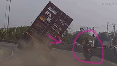 നിയന്ത്രണം വിട്ട് മറിഞ്ഞ കണ്ടെയ്നര് ലോറിയുടെ അടിയില്പ്പെടാതെ ബൈക്ക് യാത്രികന് രക്ഷപ്പെടുന്നത് തലനാരിഴയ്ക്കാണ്. ലോറിയ്ക്ക് പിന്നിലൂടെ സഞ്ചരിച്ച മറ്റൊരു വാഹനത്തിന്റെ ഡാഷ് ബോര്ഡ് ക്യാമറയിലാണ് ഞെട്ടിക്കുന്ന ദൃശ്യങ്ങള് പതിഞ്ഞത്.