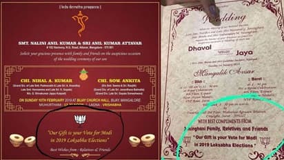 2019 ലെ ലോക്സഭാ തെരഞ്ഞെടുപ്പിൽ മോദിക്ക് വേണ്ടി നിങ്ങളുടെ വോട്ട് എന്നതാണ് ഞങ്ങള്ക്കുള്ള സമ്മാനം എന്നായിരുന്നു ക്ഷണക്കത്തിലെ പരാമര്ശം. സാമൂഹ്യമാധ്യമങ്ങളിൽ വ്യാപകമായി പ്രചരിക്കുകയാണ് ഈ ക്ഷണക്കത്ത്. ഇതുകൂടാതെ മംഗളൂരുവിൽനിന്നുള്ള മറ്റൊരു വിവാഹ ക്ഷണക്കത്തും സാമൂഹ്യമാധ്യമങ്ങളിൽ പ്രചരിക്കുന്നുണ്ട്. ഇതും മോദിക്ക് വോട്ട് ചെയ്യണമെന്ന് ആവശ്യപ്പെട്ടുകൊണ്ടുള്ള ക്ഷണക്കത്താണ്. മംഗളൂരു സ്വദേശിയായ അരുൺ പ്രസാദാണ് വിവാഹക്ഷണക്കത്തിന്റെ ചിത്രം സാമൂഹ്യമാധ്യമങ്ങളിൽ പങ്കുവച്ചത്.
