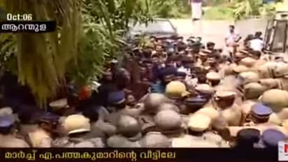 ആറന്മുള: ശബരിമല സ്ത്രീ പ്രവേശന വിഷയവുമായി ബന്ധപ്പെട്ട് ദേവസ്വം ബോർഡ് പ്രസിഡന്റ് എ. പത്മകുമാറിന്റെ ആറന്മുളയിലെ വീട്ടിലേക്ക് യുവമോർച്ച പ്രവർത്തകർ നടത്തിയ മാർച്ചിൽ നേരിയ സംഘർഷം. പൊലീസ് ബാരിക്കേഡ് ഭേദിച്ച് പ്രവർത്തകർ വീട്ടിലേക്ക് തള്ളി കയറാൻ ശ്രമിച്ചു.സംഘർഷത്തിൽ യുവമോർച്ച സംസ്ഥാന പ്രസിഡന്റ് അഡ്വ.പ്രകാശ് ബാബുവിന് നേരിയ പരിക്കേറ്റു. വിധിയിൽ പുനപരിശോധന ഹർജി നൽകാത്ത ദേവസ്വം ബോർഡ് നിലപാടിൽ പ്രതിഷേധിച്ചായിരുന്നു മാർച്ച്. 'സ്വാമിയേ ശരണമയ്യപ്പ' എന്ന മുദ്രവാക്യവും ചൊല്ലിക്കൊണ്ടാണ് യുവമോര്ച്ച പ്രവര്ത്തകര് മാര്ച്ച് നടത്തുന്നത്.