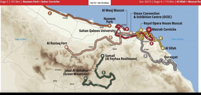 നാളത്തെ സൈക്ലിംഗ് ടൂര് 'ജബല് അല് സിഫഹ'യില് നിന്നും ആരംഭിച്ച് 'മസ്കറ്റ് റോയല് ഒപ്പേറ ഹൗസില്' അവസാനിക്കും. 119.5 കിലോമീറ്റര് ദൂരമാണ് നാളത്തെ സൈക്ലിംഗ് മത്സര ദൂരം. ഫെബ്രുവരി പതിനാല് തിങ്കളാഴ്ച സുമേയില് അല് ഫെഹ്യാ റസ്റ്റ് ഹൗസില് നിന്നും ആരംഭിക്കുന്ന സൈക്ലിംഗ് ജബല് അക്തറില് അവസാനിക്കും. അവസാന ദിവസം മസ്കറ് 'അല് മൗജ്' മുതല് മാത്ര കൊര്ണേഷ് വരെയായിരിക്കും സൈക്ലിംഗ് മത്സരം. ഫെബ്രുവരി പത്തിന് ആരംഭിച്ച ടൂര് ഓഫ് ഒമാന്' സൈക്ലിങ് ഫെബ്രുവരി പതിനഞ്ചിനു അവസാനിക്കും. 891 കിലോമീറ്ററാണ് മത്സരത്തിന്റെ വിവിധ ഘട്ടങ്ങളിലായുള്ള ആകെ ദൂരം.