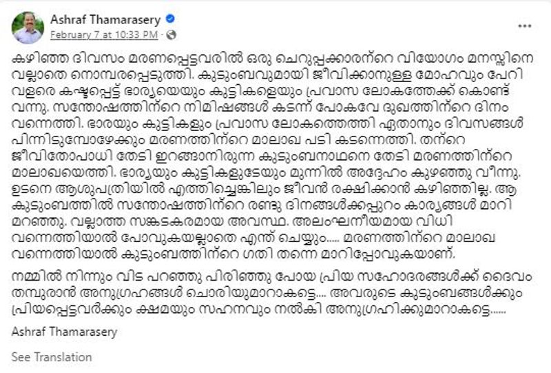 അഷ്റഫ് താമരശ്ശേരിയുടെ ഫേസ്ബുക്ക് പോസ്റ്റിന്റെ പൂര്ണരൂപം