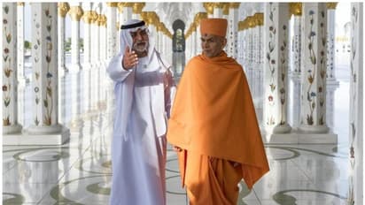 അബുദാബിയിലെ ക്ഷേത്ര നിര്മാണ ചുമതയലയുള്ള ബാപ്സ് സ്വാമിനാരായണ് സന്സ്തയുടെ നേതാക്കള് യുഎഇ ഭരണകൂടത്തിന്റെ അതിഥിയായാണ് എത്തിയത്. പള്ളി സന്ദര്ശിക്കുന്നതിന് മുന്പ് സന്യാസി സംഘം ശൈഖ് നഹ്യാന് ബിന് മുബാറകുമായി കൂടിക്കാഴ്ച നടത്തിയിരുന്നു. 50 പുരോഹിതര്ക്കൊപ്പം പ്രവാസി വ്യവസായിയും ക്ഷേത്ര കമ്മിറ്റി അധ്യക്ഷനുമായ ബി.ആര് ഷെട്ടിയുമുണ്ടായിരുന്നു. സ്വാമിയെയും സംഘത്തെയും ശൈഖ് നഹ്യാന് തന്നെ ഗോള്ഫ് കാര്ട്ട് ഓടിച്ച് ഗ്രാന്റ് മോസ്കിന്റെ വിവിധ ഭാഗങ്ങള് പരിചയപ്പെടുത്തി. ശേഷം രക്തസാക്ഷി സ്മാരകത്തിലേക്കും ഗോള്ഫ് കാര്ട്ടില് സ്വാമിയെയും സംഘത്തെയും ശൈഖ് നഹ്യാന് കൊണ്ടുപോയി.
