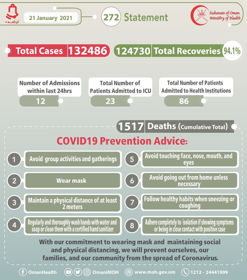 കഴിഞ്ഞ 24 മണിക്കൂറിനിടയില് കൊവിഡ് ബാധിച്ചു ഒരു മരണമാണ് റിപ്പോര്ട്ട് ചെയ്യപ്പെട്ടിട്ടുള്ളത്. ഇതോടെ കൊവിഡ് ബാധിച്ച് ഒമാനില് മരിച്ചവരുടെ എണ്ണം 1517 ആയി. കഴിഞ്ഞ 24 മണിക്കൂറിനുള്ളില് 151 പേര്ക്കാണ് രോഗം ഭേദമായത്. ഇവരുള്പ്പെടെ 1,24,730 പേര് രോഗമുക്തരായിട്ടുണ്ട്.രാജ്യത്തെ രോഗമുക്തി നിരക്ക് ഇപ്പോള് 94.1 ശതമാനമാണെന്നും പ്രസ്താവനയില് പറയുന്നു.