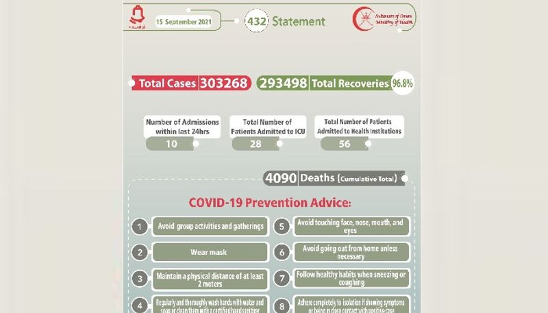 രാജ്യത്ത് ഇതുവരെ കൊവിഡ് സ്ഥിരീകരിച്ചവരുടെ എണ്ണം 3,03,268 ആയി.ആകെ രോഗികളില് 2,93,498 പേരും രോഗമുക്തരായി. 96.8 ശതമാനമാണ് ഇപ്പോഴത്തെ രോഗമുക്തി നിരക്ക്. ആകെ 4,090 പേര്ക്ക് ഒമാനില് കൊവിഡ് കാരണം ജീവന് നഷ്ടമായി. കഴിഞ്ഞ 24 മണിക്കൂറിനിടെ ആകെ 10 കൊവിഡ് രോഗികളെ മാത്രമാണ് ആശുപത്രികളില് പ്രവേശിപ്പിക്കേണ്ടി വന്നത്. ഇവരുള്പ്പെടെ ആകെ 56 പേരാണ് ഒമാനിലെ ആശുപത്രികളില് കഴിയുന്നത്. ഇവരില് 28 പേരുടെ നില ഗുരുതരമാണ്.
