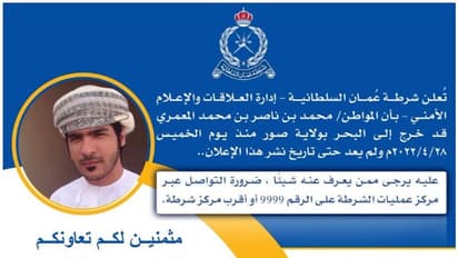 ഇദ്ദേഹം കടലിൽ പോയിട്ടുണ്ടെന്നാണ് പോലീസിന്റെ അറിയിപ്പിൽ വ്യക്തമാക്കുന്നത്. മുഹമ്മദ് ബിൻ നാസ്സർ ബിൻ മുഹമ്മദ് അൽ മാമരിയെപറ്റി എന്തെങ്കിലും വിവരം ലഭിക്കുന്നവര് അടുത്തുള്ള പൊലീസ് സ്റ്റേഷനിലോ 9999 എന്ന നമ്പറിലോ ബന്ധപ്പെടണമെന്ന് റോയല് ഒമാന് പൊലീസ് ആവശ്യപ്പെട്ടു.