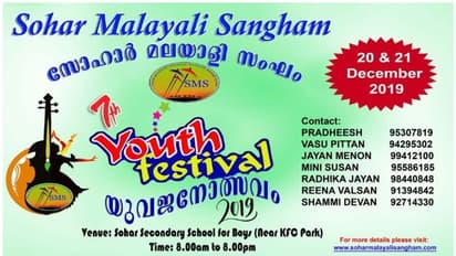 മസ്കറ്റ്: സൊഹാർ മലയാളി സംഘത്തിന്റെ ഏഴാമത് യുവജനോത്സവം 2019 ഡിസംബർ 20, 21 തീയതികളിൽ സൊഹാർ ഹംബർ പാർക്കിനടുത്തുള്ള സെക്കന്ഡറി സ്കൂളിൽ നടക്കും. ഒമാനിലെ വിവിധ വിദ്യാലയങ്ങളിലെ ഇരുന്നൂറിൽപ്പരം കുട്ടികൾ പങ്കെടുക്കുന്ന മത്സരങ്ങൾ മൂന്നു വേദികളിലായാണ് അരങ്ങേറുക.