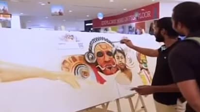 പ്രതിസന്ധികളെ അതിജീവിച്ച് സുവര്ണ കാലത്തിലേക്കുള്ള ചുവടുകളുമായി കഥകളി വേഷവും കാന്വാസില് ഇടം പിടിച്ചു. ലോകത്തിന്റെ വിവിധ ഭാഗങ്ങളില് നിന്നുള്ള സഹായഹസ്തം പ്രതീക്ഷയോടെ നോക്കി നില്ക്കുന്ന കേരള ബാല്യമെന്ന പ്രമേയത്തില് നടന്ന രചന ശ്രദ്ധേയമായി.