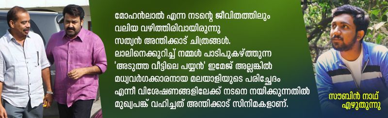 ഈ വീക്ഷണകോണിലൂടെ വായിച്ചാൽ, മോഹൻലാൽ എന്ന നടന്റെ ജീവിതത്തിലും വലിയ വഴിത്തിരിവായിരുന്നു സത്യന് അന്തിക്കാട് ചിത്രങ്ങള്. ലാലിനെക്കുറിച്ച് നമ്മൾ പാടിപുകഴ്ത്തുന്ന 'അടുത്ത വീട്ടിലെ പയ്യൻ' ഇമേജ് അല്ലങ്കിൽ മധ്യവർഗക്കാരനായ മലയാളിയുടെ പരിച്ഛേദം എന്നീ വിശേഷണങ്ങളിലേക്ക് നടനെ നയിക്കുന്നതിൽ മുഖ്യപങ്ക് വഹിച്ചത് അന്തിക്കാട് സിനിമകളാണ്. മോഹൻലാലിൽ മറഞ്ഞിരുന്നിരുന്ന സാധാരണക്കാരനായ, കുറവുകളും പരിമിതികളുമുള്ള 'മിഡിൽ ക്ലാസ്സ്' മലയാളി യുവാവിനെ സത്യൻ അന്തിക്കാട് കണ്ടെടുക്കുകയായിരുന്നു. ആ നടന്റെ ചലച്ചിത്രജീവിതത്തെ 'ടി. പി. ബാലഗോപാലൻ MA'ക്ക് മുൻപും പിൻപും എന്ന് അടയാളപ്പെടുത്തുന്നതില് അത്ര അതിശയോക്തി ഉണ്ടാവില്ല. അത് ആ ചിത്രംകൊണ്ട് മാത്രമല്ല. 1986, മോഹൻലാൽ എന്ന നടന്റെ ജീവിതത്തിലെ സുപ്രധാന വർഷമാണ്. 'പഞ്ചാഗ്നി', 'മഴപെയ്യുന്നു മദ്ദളംകൊട്ടുന്നു', 'കരിയിലകാറ്റുപോലെ', 'നിന്നിഷ്ടം എന്നിഷ്ടം', 'ദൂരെ ദൂരെ ഒരു കൂടുകൂട്ടാം', 'ദേശാടനക്കിളികൾ കരയാറില്ല', 'രാജാവിന്റെ മകൻ', 'ഗാന്ധിനഗർ സെക്കന്ഡ് സ്ട്രീറ്റ്', 'നമുക്ക് പാർക്കാൻ മുന്തിരിത്തോപ്പുകൾ', 'സുഖമോ ദേവി', 'താളവട്ടം' എന്നിങ്ങനെ വ്യത്യസ്തവും മികച്ചതുമായ ചിത്രങ്ങളിൽ ലാൽ അഭിനയിച്ചത് ഈ വർഷമാണ്. പക്ഷെ, മികച്ച നടനുള്ള ആ വർഷത്തെ സംസ്ഥാന അവാർഡ് ലാലിന് നേടികൊടുത്തതാകട്ടെ 'ടി. പി. ബാലഗോപാലൻ MA'യിലെ പ്രകടനവും. ആ വർഷംതൊട്ടാണ് മോഹൻലാൽ മലയാളിയുടെ ചലച്ചിത്ര സദ്യയിലെ ഒഴിവാക്കാനാവാത്ത വിഭവമായതും. താൻ അനുഭവിച്ചിരുന്ന ഒരുതരം സ്വത്വപ്രതിസന്ധി ആ നടൻ സത്യൻ അന്തിക്കാടിലൂടെ മറികടന്നു എന്നുവേണം വായിച്ചെടുക്കാൻ.