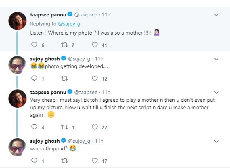 തപ്സിയുടെ കമന്റിന് സംവിധായകന്റെ മറുപടി, ചിത്രം ശരിയാക്കുകയാണ്, ഇപ്പോളിടും എന്നതായിരുന്നു. പിന്നെവന്ന തപ്സിയുടെ കമന്റാണ് ആരാധകര്ക്ക് ആശയക്കുഴപ്പം സൃഷ്ടിച്ചിരിക്കുന്നത്. ഇത് വളരെ ചീപ്പായിപ്പോയി, ആദ്യത്തെക്കാര്യം ഞാന് അമ്മയായി അഭിനയിക്കാന് സമ്മതിച്ചു, എന്നിട്ട് നിങ്ങളെന്റെ ഫോട്ടോ പോലും ഇടുന്നില്ല, അടുത്ത സ്ക്രിപ്റ്റ് പൂര്ത്തികരിച്ചിട്ട് വരൂവെന്നാണ് തപ്സി കുറിച്ചത്. ഉടനെവന്നു സംവിധായകന്റെ മറുപടി, താപ്സിയുടെ പുതിയ സിനിമയായ ഥപ്പടിന്റെ പേര് വച്ചുതന്നെയാണ് മറുപടി, മുഖത്തടിക്കുമെന്ന മുന്നറിയിപ്പാണോ എന്നാണ് സുജോയ് ചോദിക്കുന്നത്. ഥപ്പട് എന്നാല് മുഖമടച്ചുള്ള അടി എന്നാണ് ഹിന്ദി അര്ത്ഥം.