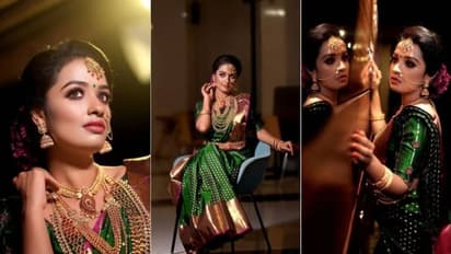 കഴിഞ്ഞ ദിവസം മെര്ഷീന പങ്കുവച്ച ബ്രൈഡല് ഫോട്ടോഷൂട്ടാണിപ്പോള് ആരാധകര് ഏറ്റെടുത്തിരിക്കുന്നത്. പരമ്പരയില് ആണ്വേഷത്തില് കാണുന്ന മെര്ഷിനയെ പെട്ടന്ന് സോ കോള്ഡ് ബ്രൈഡല് വേഷത്തില് കണ്ട അമ്പരപ്പാണ് ചിത്രങ്ങള്ക്ക് കമന്റായെത്തുന്നത്. അമല്കുമാറിന്റെ ചിത്രം പകര്ത്തലിനായി അഭിലാഷ് ചിക്കുവാണ് മനോഹരമായി താരത്തെ ഒരുക്കിയിരിക്കുന്നത്. സില്ക് ഡോട്ടുകളുള്ള ഗ്രീന് സില്ക് ബ്രൈഡല് സാരിയിലാണ് മെര്ഷിന ചിത്രത്തിലെത്തുന്നത്. കൂടാതെ മനോഹരമായ ജ്വല്ലറികളും താരത്തെ കൂടുതല് സുന്ദരിയാക്കുന്നുണ്ട്.