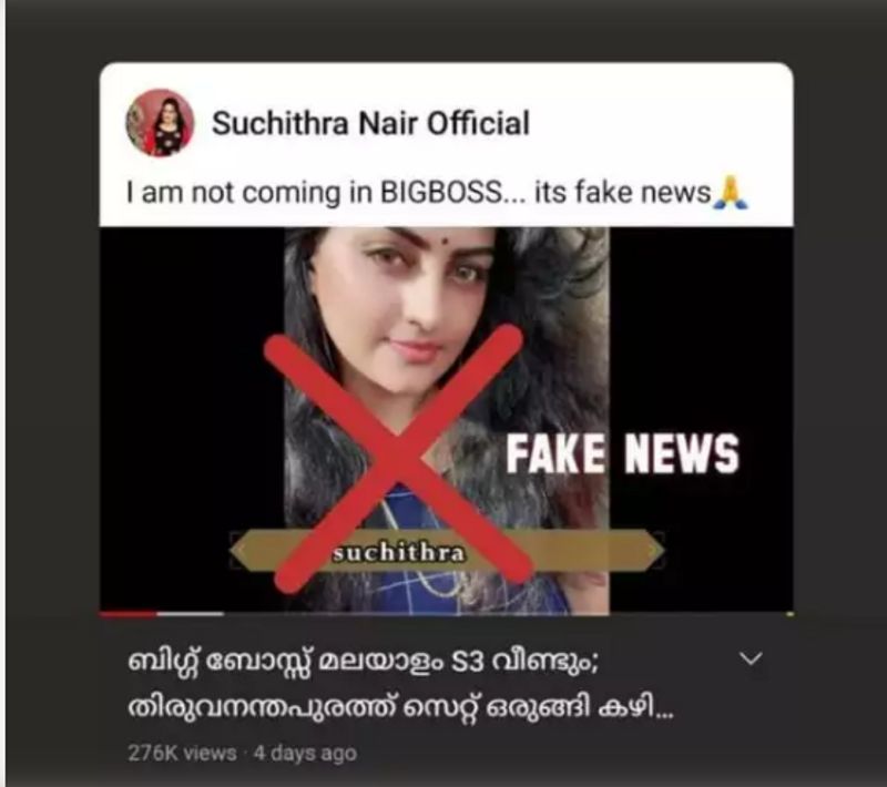 ഓൺലൈനിൽ പ്രചരിച്ച ഒരു വാർത്തയുടെ സ്ക്രീൻഷോട്ട് പങ്കിട്ട സുചിത്ര, 'ഞാൻ ബിഗ് ബോസിൽ വരുന്നില്ല, ഇത് വ്യാജ വാർത്തയാണ്' എന്ന് കുറിക്കുന്നു.