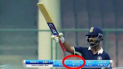 എന്നാല്, അപ്പോഴും രഹാനെയുടെ പേരില് 97 റണ്സ് മാത്രമാണ് കുറിക്കപ്പെട്ടിരുന്നത്. രഹാനെ ബാറ്റ് ഉയര്ത്തിയതോടെ ഡ്രസിംഗ് റൂമിലിരുന്ന സഹതാരം സുരേഷ് റെയ്ന എഴുന്നേറ്റ് നിന്ന് മൂന്ന് റണ്സ് കൂടെ ശതകത്തിലേക്ക് ഉണ്ടെന്ന് ആംഗ്യം കാണിക്കുന്നുമുണ്ട്. എന്നാല്, സ്കോര് ബോര്ഡ് കെെകാര്യം ചെയ്യുന്നയാള്ക്ക് സംഭവിച്ച തെറ്റ് രഹാനയ്ക്ക് വലിയ പണിയാണ് കൊടുത്തത്.