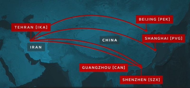 ഫ്ലൈറ്റ് ഡാറ്റയുടെ വിശകലനത്തിൽ ബിബിസി കണ്ടെത്തിയത് ജനുവരി 21 മുതൽ ഏപ്രിൽ 20 വരെ ഇറാൻ മഹാൻ എയർ വിമാനങ്ങളെ ചൈനയിലെ നാല് നഗരങ്ങളിലേക്ക്, ഷാങ്ഹായി, ബെയ്ജിങ്, ഗ്വാങ്ങ്സു, ഷെൻസെൻ എന്നീ നാലു സുപ്രധാന വാണിജ്യ കേന്ദ്രങ്ങളിലേക്ക് സർവീസ് നടത്താൻ അനുവദിച്ചു.