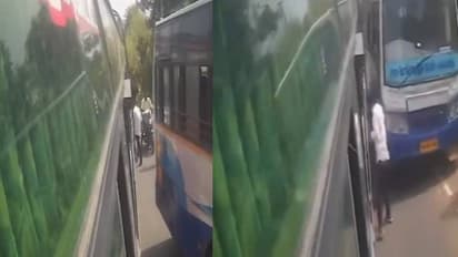 യുവാവ് രണ്ടു ബസിനും ഇടയിൽ അമർന്നു പോയേക്കാവുന്ന അവസ്ഥയാണ് ഇവിടെ ഉണ്ടാകുന്നത്. എന്നാൽ, യുവാവ് താഴേക്ക് വീഴുന്നു. അതിനാൽ തന്നെ യുവാവ് പരിക്കേൽക്കാതെ രക്ഷപ്പെടുന്നത് കാണാം. അപ്പോഴേക്കും രണ്ട് ബസുകളും നിർത്തുന്നുണ്ട്. ആദ്യം പോയിരുന്ന ബസിൽ നിന്നും ജീവനക്കാരൻ പുറത്തിറങ്ങുന്നതും യുവാവിനെ ഇടിച്ച ബസിലെ ഡ്രൈവറോട് കയർക്കുന്നതും കാണാം. പിന്നാലെ മറ്റ് ആളുകളും ആ ബസിന്റെ അടുത്തുകൂടി പോകുന്നത് കാണാം.