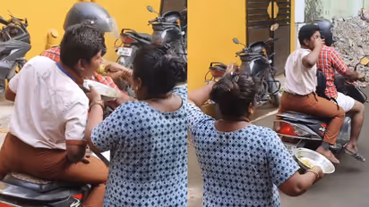 ഹെൽമറ്റ് ധരിച്ച ഒരാൾക്ക് പിന്നിലായി യൂണിഫോം ധരിച്ച്, സ്കൂട്ടറിൽ ഇരിക്കുന്ന കുട്ടിക്ക് സ്കൂളിലേക്ക് പോകും മുമ്പ് അമ്മ ഭക്ഷണം വാരിക്കൊടുക്കുന്ന രംഗമാണിത്. കുട്ടി ഭക്ഷണം നന്നായി കഴിക്കുന്നുണ്ട് എന്ന് ഉറപ്പ് വരുത്താനായി അമ്മ കൂടെത്തന്നെ നിൽക്കുന്നതും മുഴുവൻ ഭക്ഷണവും അവന് വാരിക്കൊടുക്കുന്നതും കാണാം. കുട്ടി വേണ്ട എന്ന് പറയുമ്പോഴും അമ്മ അവനെ നിർബന്ധിച്ച് കഴിപ്പിക്കുകയാണ്. ഒടുവിൽ ഭക്ഷണമെല്ലാം കഴിച്ച് തീർത്ത് അവൻ പോകുന്നത് കാണാം. പോകും വഴിക്ക് ഫ്ലയിങ് കിസ് കൊടുക്കുന്നതും വീഡിയോയിൽ കാണാവുന്നതാണ്.