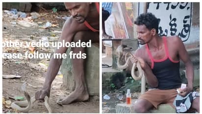 കാകി വെങ്കിടേഷ് എന്ന ഇന്സ്റ്റാഗ്രാം അക്കൌണ്ടില് നിന്നും പങ്കുവച്ച മറ്റൊരു വീഡിയോയില് ഇയാള് പാമ്പിനെ ഒരു കൈ കൊണ്ട് പിടിച്ച് തന്റെ മുഖത്തിന് സമീപത്തേക്ക് ഉയര്ത്തുന്നതും കാണാം. സംഭവത്തിന്റെ വീഡിയോ മൂന്നാല് പാര്ട്ട് ആയിട്ടാണ് ഇന്സ്റ്റാഗ്രാമില് പങ്കുവച്ചത്. ഓരോ വീഡിയോയിലും ഇയാള് തന്റെ മുന്നില് പത്തിവിടര്ത്തി നില്ക്കുന്ന മൂര്ഖന് പാമ്പിനെ മുന്നിലേക്ക് തന്റെ കൈകൊണ്ടുപോകുന്നതും കാണാം. ദശലക്ഷക്കണക്കിന് ആളുകളാണ് വീഡിയോകണ്ടത്. 'പാമ്പും 90 മില്ലിക്കായി കാത്തിരിക്കുന്നു' എന്നായിരുന്നു ഒരു കാഴ്ചക്കാരന് എഴുതിയത്. 'പാമ്പ് ചിന്തിക്കുന്നത്, എന്തുകൊണ്ട് ഇവന് എന്നെ ഭയപ്പെടുന്നില്ല?' എന്നായിരുന്നു മറ്റൊരു കാഴ്ചക്കാരന് കുറിച്ചത്. ആന്ധ്രാപ്രദേശിലെ സത്യസായി ജില്ലയിലെ കദിരിയിൽ നിന്നുള്ള നാഗരാജു എന്ന യുവാവാണ് വീഡിയോയില് ഉള്ളത്. മദ്യ ലഹരിയിലായിരുന്ന ഇയാള് കാട്ടിലേക്ക് കയറിപ്പോവുകയായിരുന്ന മൂര്ഖന് പാമ്പിനെ പിടിച്ച് തന്റെ അടുത്ത് ഇരുത്തുകയായിരുന്നുവെന്ന് റിപ്പോര്ട്ടുകള് പറയുന്നു. പിന്നീട് ദേഹാസ്വാസ്ഥ്യം തോന്നിയ ഇയാളെ ആശുപത്രിയിലാക്കിയെന്ന ന്യൂസ് 18 റിപ്പോര്ട്ട് ചെയ്യുന്നു. എന്നാല് കൂടുതല് വിവരങ്ങള് ലഭ്യമല്ല.