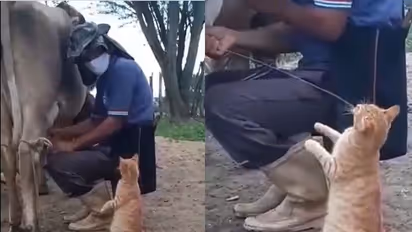 വീഡിയോയിലുള്ളത് ഒരാളും ഒരു പശുവും ഒരു പൂച്ചയുമാണ്. അയാള് പശുവിനെ കറന്ന് പാലെടുക്കുകയാണ്. അയാളുടെ വളര്ത്തു പൂച്ച അരികത്തു തന്നെ നില്ക്കുന്നുണ്ട്. പൂച്ച വെറുതെ നില്ക്കുകയല്ല. അയാള് ചെയ്യുന്നത് നോക്കി പിന്കാലുകളില് കുത്തി ഉയര്ന്നാണ് അത് നില്ക്കുന്നത്. അയാള് പൂച്ചയെ സ്നേഹത്തോടെ പരിഗണിച്ചു കൊണ്ട് തന്റെ പ്രവൃത്തി തുടരുന്നു.