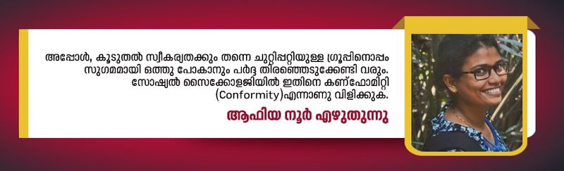 അപ്പോള്, കൂടുതല് സ്വീകര്യതക്കും തന്നെ ചുറ്റിപ്പറ്റിയുള്ള ഗ്രൂപ്പിനൊപ്പം സുഗമമായി ഒത്തു പോകാനും പര്ദ്ദ തിരഞ്ഞെടുക്കേണ്ടി വരും. സോഷ്യല് സൈക്കോളജിയില് ഇതിനെ കണ്ഫോമിറ്റി (Conformity)എന്നാണു വിളിക്കുക. സമൂഹത്തില് നിലവിലുള്ള വിശ്വാസങ്ങള്ക്കും നിയമങ്ങള്ക്കുമൊത്തു പോകാനുള്ള മനുഷ്യന്റെ പ്രവണതയാണത്. കൂടുതല് പ്രശ്നങ്ങള് ഒഴിവാക്കാനും കൂടുതല് സ്വീകര്യതക്കുമൊക്കെയാണ് ഈ പ്രവണത ഉണ്ടാവുന്നത്. ഒരു വ്യക്തിയുടെ മൈന്ഡ് സെറ്റ്, പ്രത്യക്ഷമോ പരോക്ഷമോ ആയ സോഷ്യല് പ്രഷര് തുടങ്ങിയ പലതും ഇതിനു കാരണമാകാറുണ്ട്.